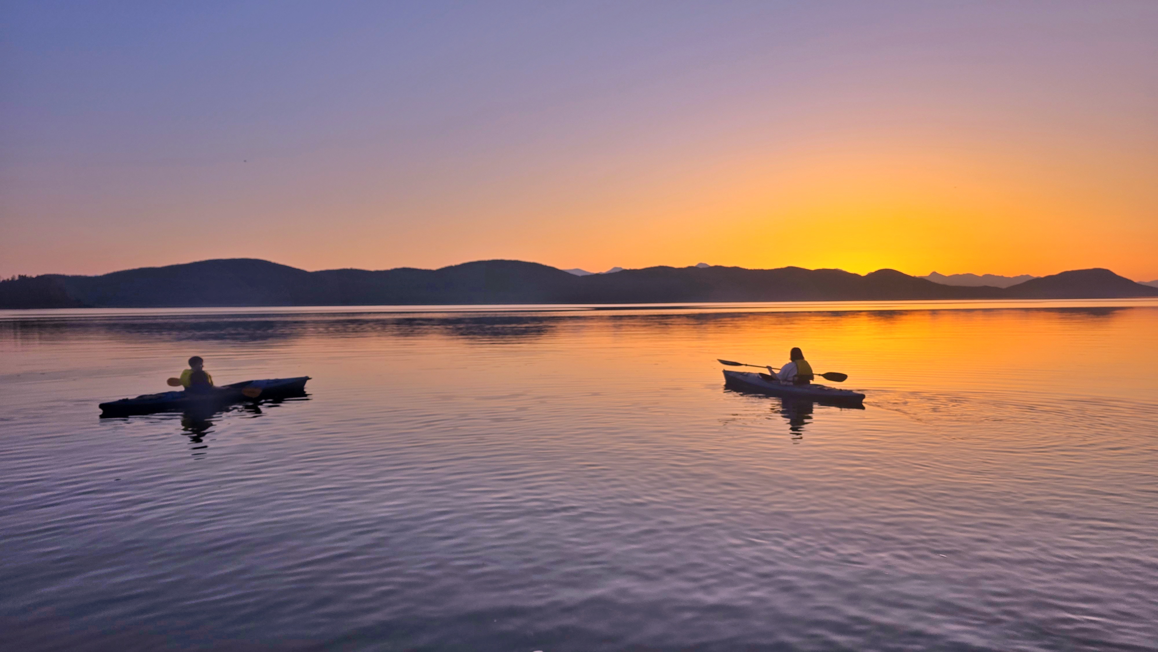 A raft of otters drift nearby: peering at us with dark, curious eyes. Overhead, a bald eagle crosses the sky, its white head bright against the vibrant sunset sky, riding the evening air with effortless command.