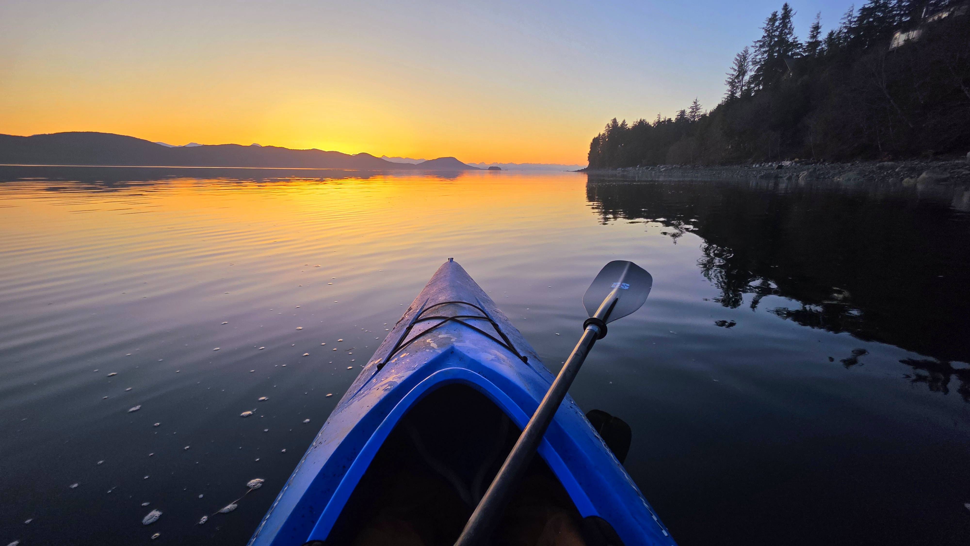 Our kayaks glide over a calm, sunlit sea; the surface broken only by the quiet dip of paddles and the slow breathing of the ocean itself.
